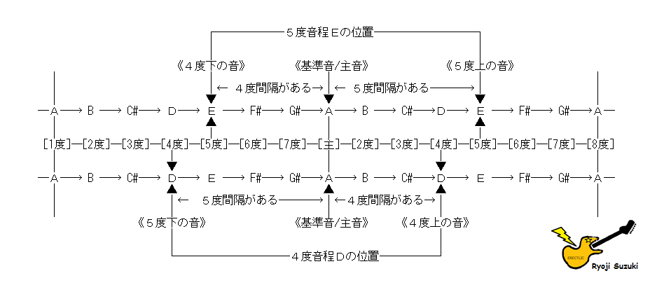 - 基準音Aより下に位置する、基準音Aの4度音程Dの音とは、基準音Aからみて《5度下の音》D のことを指す。※2.